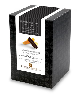 A gift cube containing superior quality sticks of candied ginger covered in fine dark chocolate.