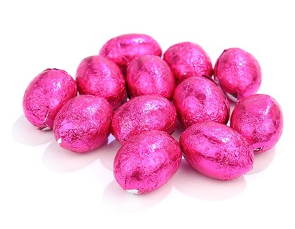 Mini chocolate Easter eggs made from solid milk chocolate. Wrapped in cerise foil. These economical Easter eggs are sold in bulk for use in Easter egg hunts & Easter themed events.