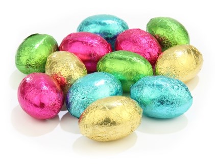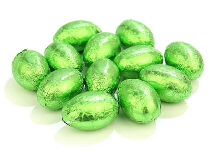 Mini chocolate Easter eggs made from solid milk chocolate. Wrapped in green foil. These economical mini Easter eggs are sold in bulk for use in Easter egg hunts & Easter themed events.