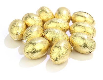Mini chocolate Easter eggs made from solid milk chocolate. Wrapped in gold foil. These economical mini Easter eggs are sold in bulk for use in Easter egg hunts & Easter themed events.