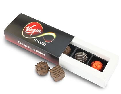 A branded chocolate box, custom printed on all available sides of the box lid and base. Complete with a branded, inner chocolate menu. Containing 3 assorted luxury chocolates. Finished with hand-tied satin ribbon.
