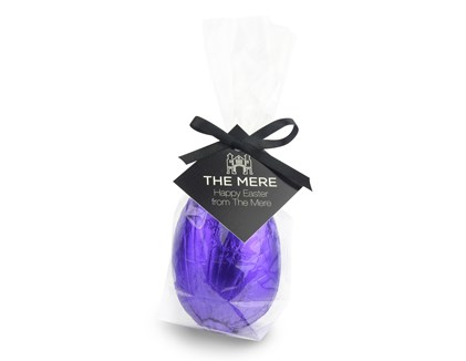 A simple and attractive gift bagged, foiled Easter egg with personalised gift tag attached with ribbon. Easter egg foil colours available are gold and silver as standard. Other foil and ribbon colours also available on request.