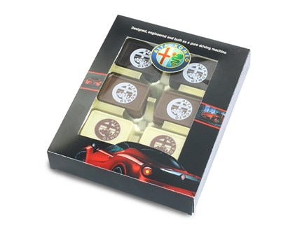 Fully personalised printed chocolate pralines in extra fine detail for corporate chocolate gifts and promotions. Created from high quality chocolate and presented within a fully personalised window box.