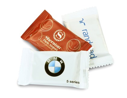 Logo printed chocolate tablets in extra fine detail printed directly onto the chocolate and flow wrapped in a clear flow wrap. Perfect for promotional giveaways, exhibitions and events.